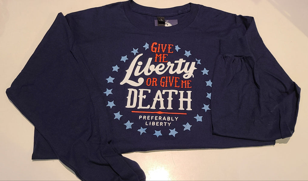 "Give me Liberty or Give me Death! (Preferably Liberty)" is our long-sleeved t-shirt design from TR Historical.