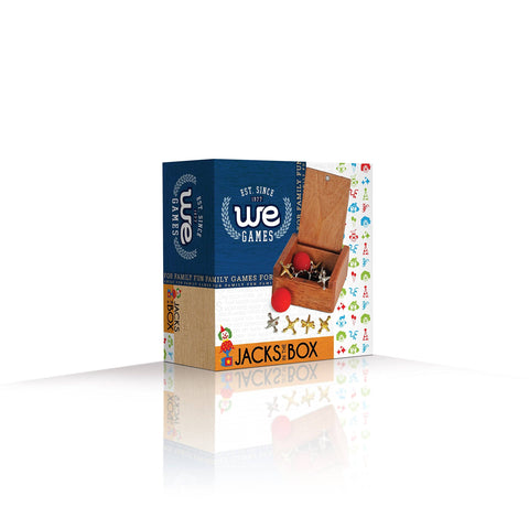 Includes one set of jacks in wooden box, 5 silver and 5 gold metal jacks, 2 red bouncy balls. Case measures 3.5 x 3.5 x 1.625 inches