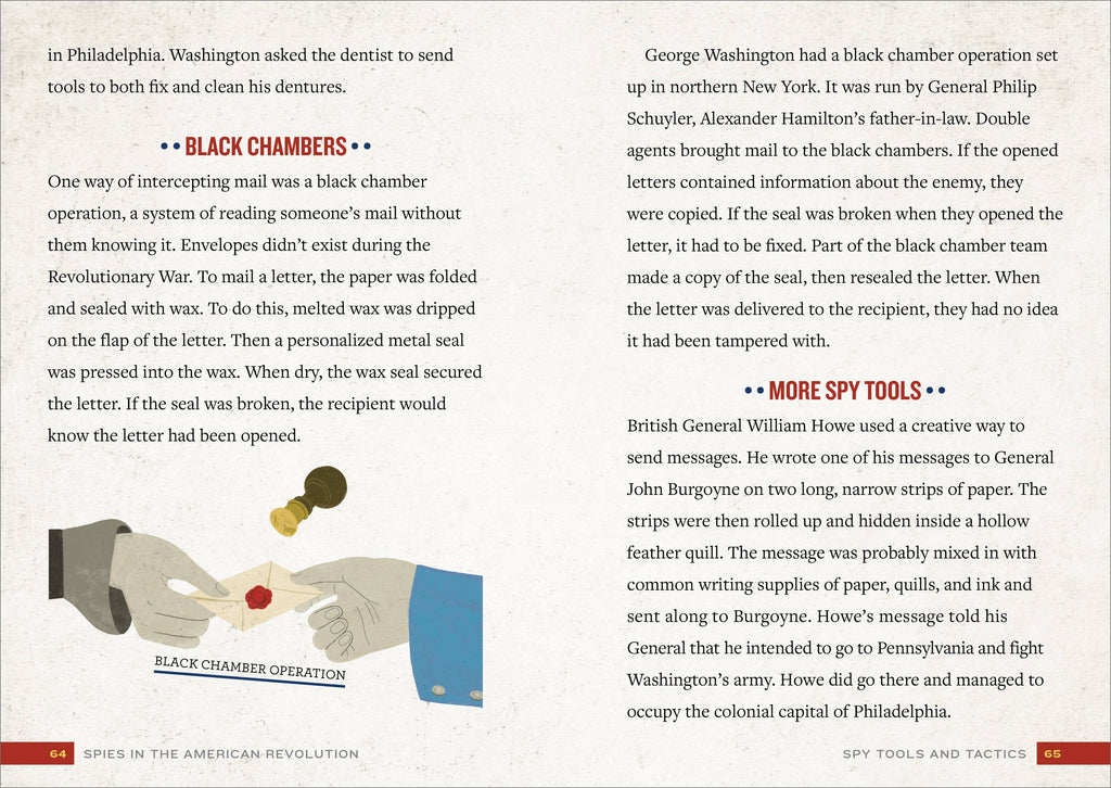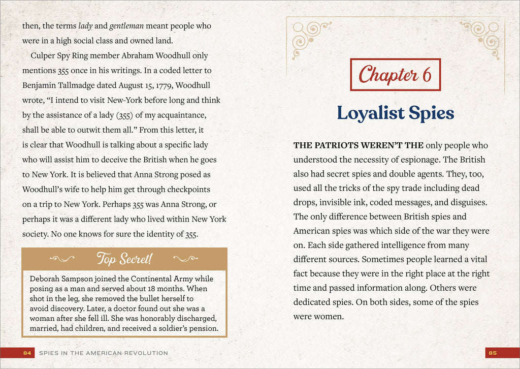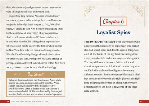 Sneak kids ages 8 to 12 behind enemy lines with this book about America’s first spies If you want to get kids interested in history, the intrigue-filled tales of spies are a great place to start. Packed with exciting stories about the brave men and women who fought off the battlefield, this unique look into the American Revolution helps history come alive through explorations of secretive plots, inventive tools, and daring disguises that are sure to captivate kids.